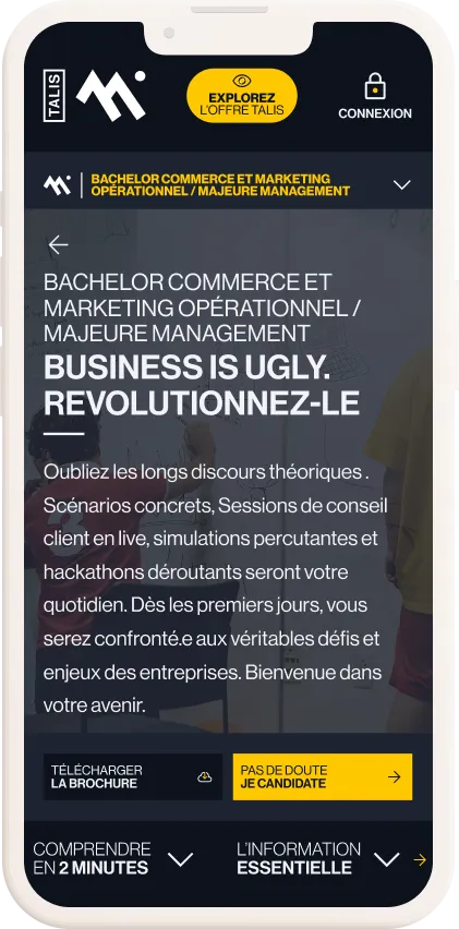Talis, une école de commerce novatrice, entreprend une métamorphose complète de son identité, sa communication et son site web. En misant sur son caractère unique et décalé, l’école vise à se distinguer dans un paysage éducatif concurrentiel. L’objectif est de refléter fidèlement l’esprit de Talis tout en répondant aux attentes variées de ses publics – étudiants, parents, professionnels et institutionnels.